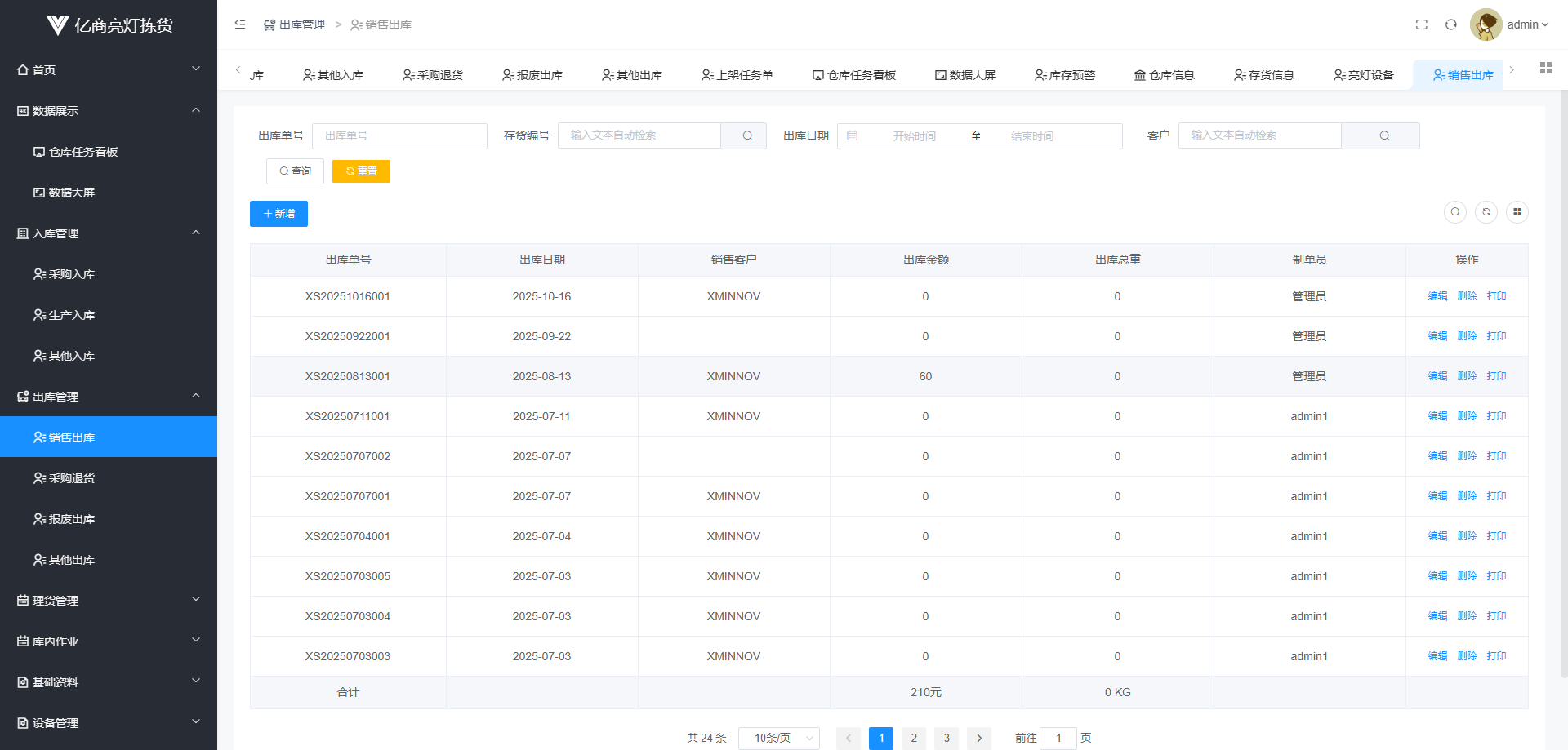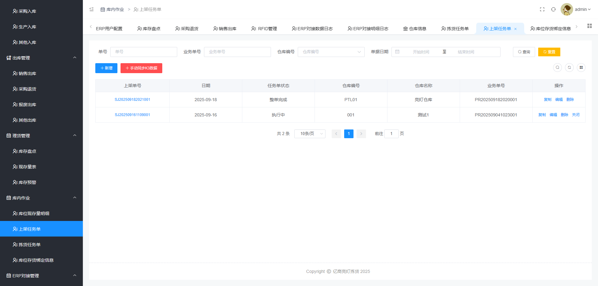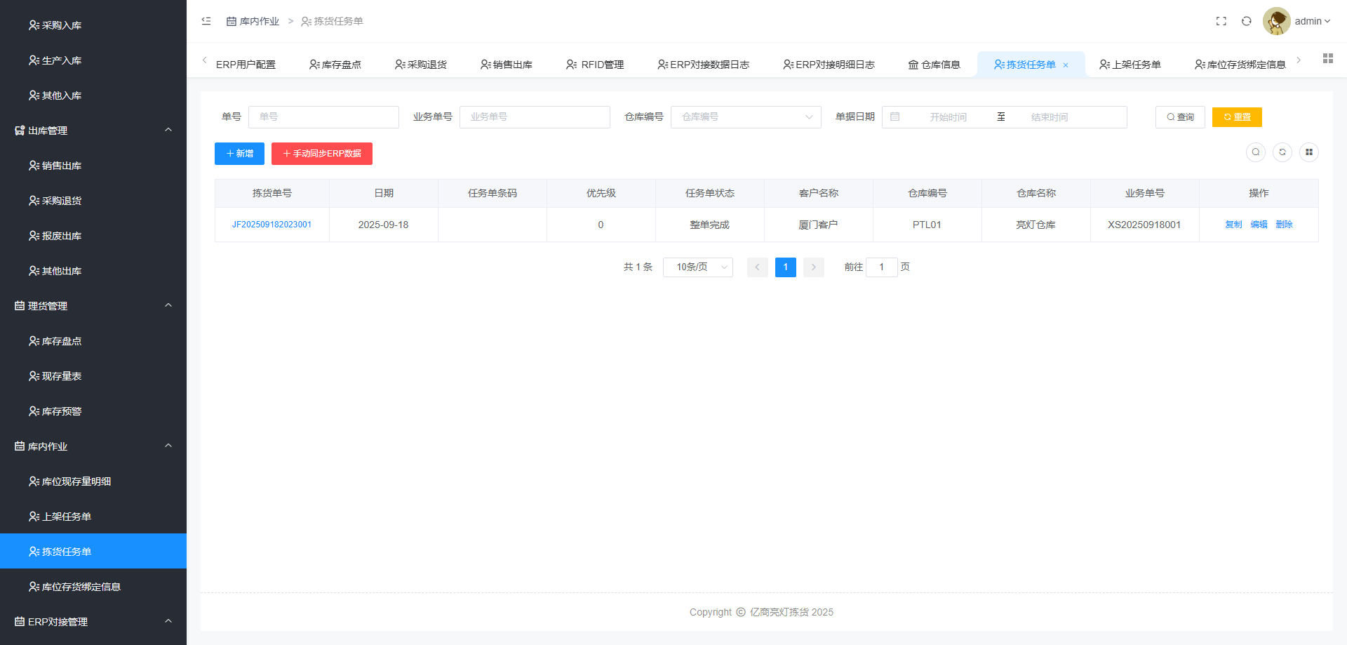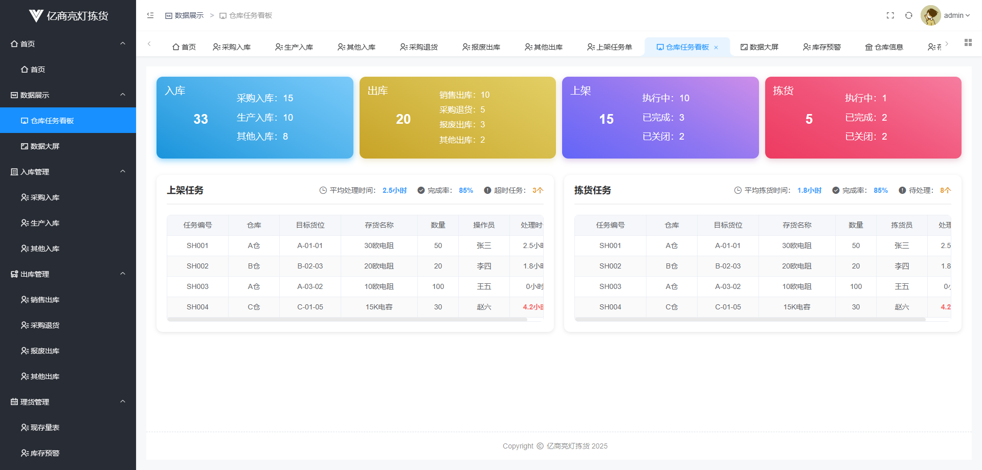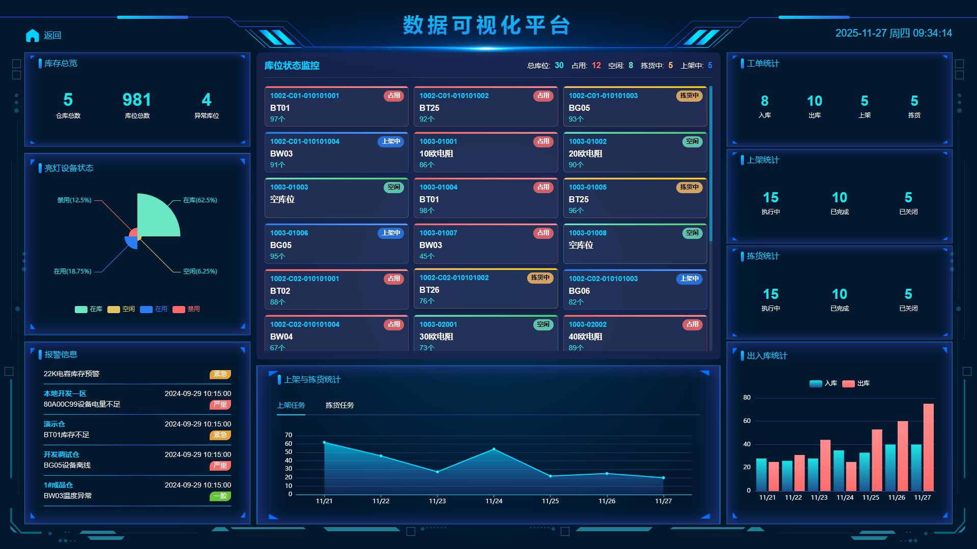 入库、出库、盘点、库存预警、上架、拣货、仓库看板、数据大屏和亮灯寻物为一体的操作系统。